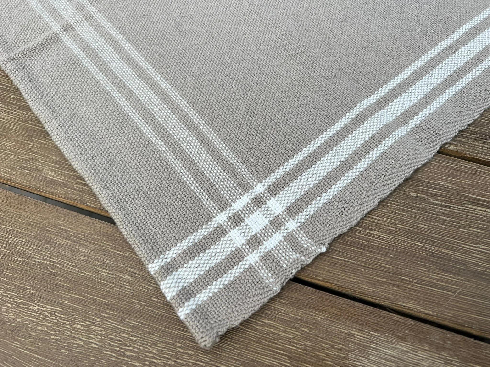 Main background is stone gray hand-woven cotton. Borders are hand-woven cotton in a twill and plaid design in sparkling white